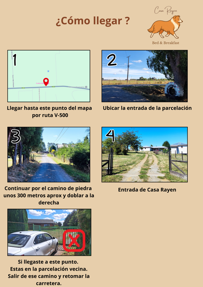 Auto : Tomar la salida norte hacia ruta V-500 y manejar 14 kilómetros en dirección hacia Nueva Braunau - Río frío - Cañitas. En 15 minutos llegarás a Casa Rayen.
