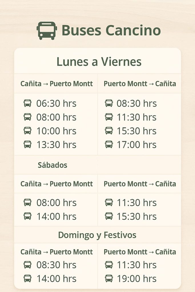b) Tomar el bus que viene desde Puerto Montt hacia Cañitas. El recorrido pasa aproximadamente cada 3 horas y se aborda en el centro de Puerto Varas. El bus te deja en la entrada de la parcelación.